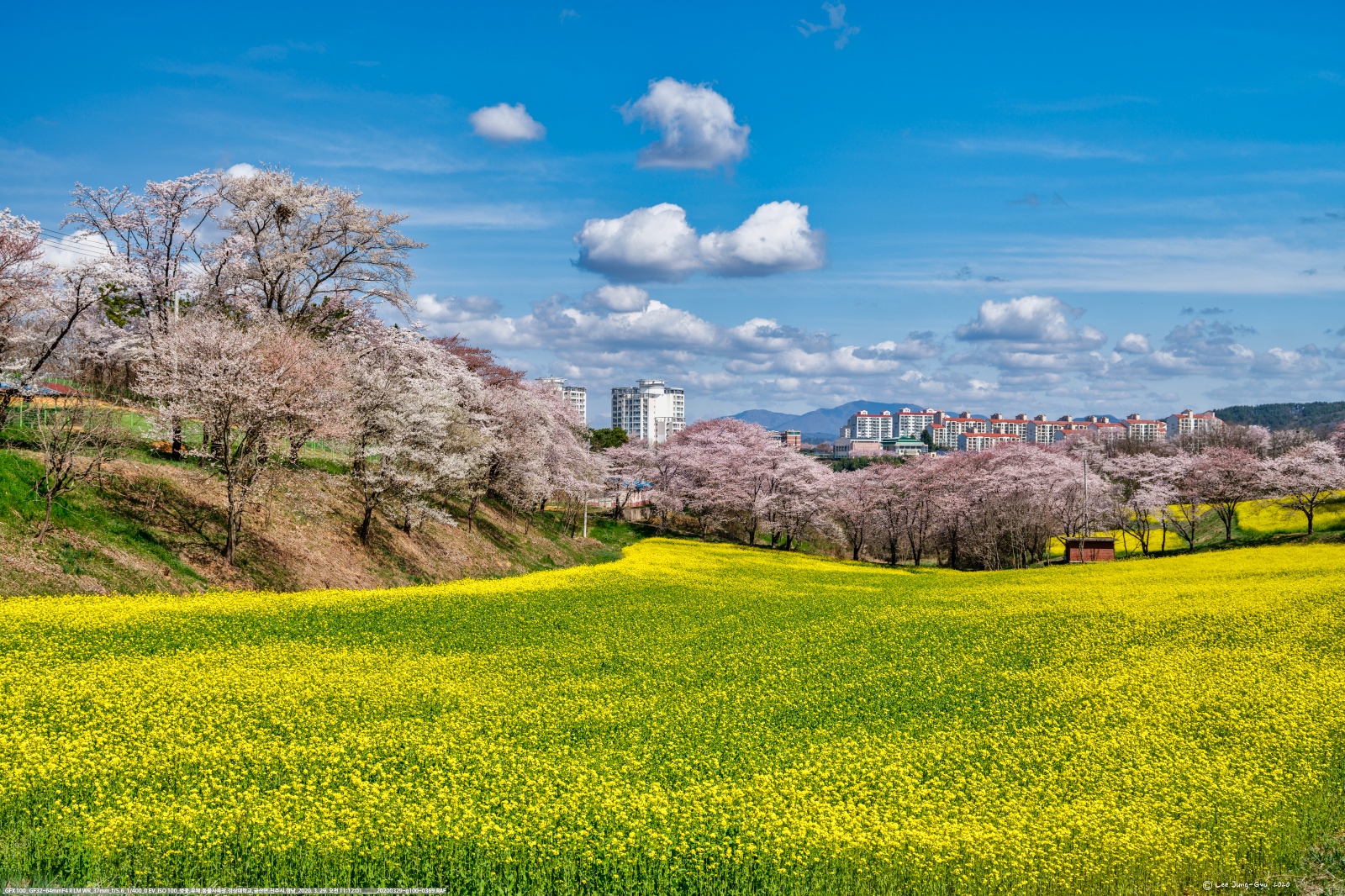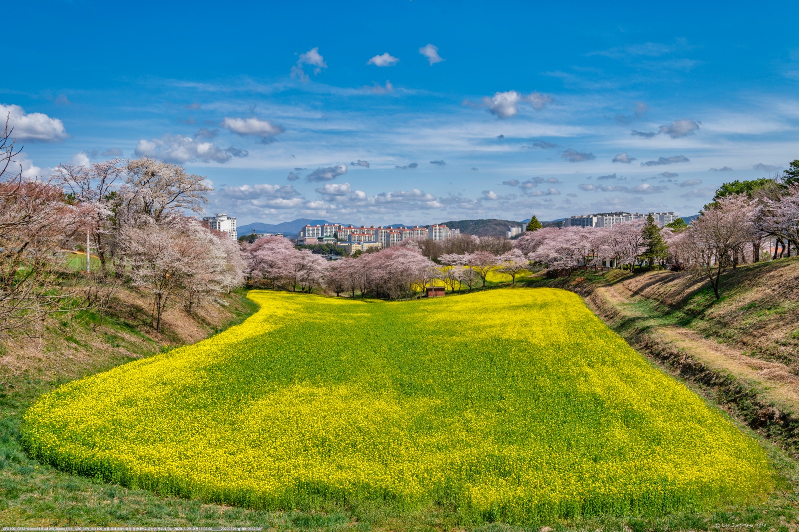 사무실 뒤 주차장 끝자락에는 수양벚꽃 한그루가 특이한 모습으로 눈길을 끈다. 그리고, 유채밭고 왕성하게 자란 벚꽃이 싱그러운 기분을 더한다.